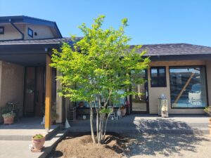 【植栽事例】建物を引き立てるシンボルツリー。緑と赤のコントラストで魅せる庭へ