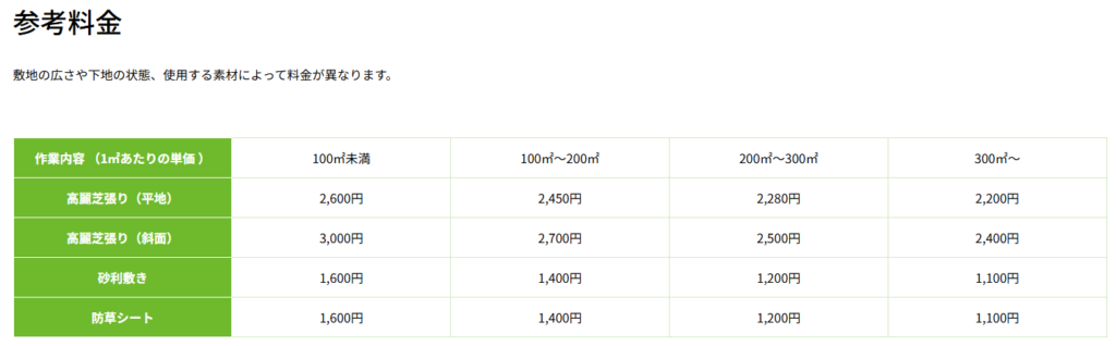 緑地開発では敷地や下地の状態、使用する素材によって費用が異なるのを前提としつつ、初めて依頼するお客様の不安解消のため、ホームページに上記画像のように参考料金を掲載しています。